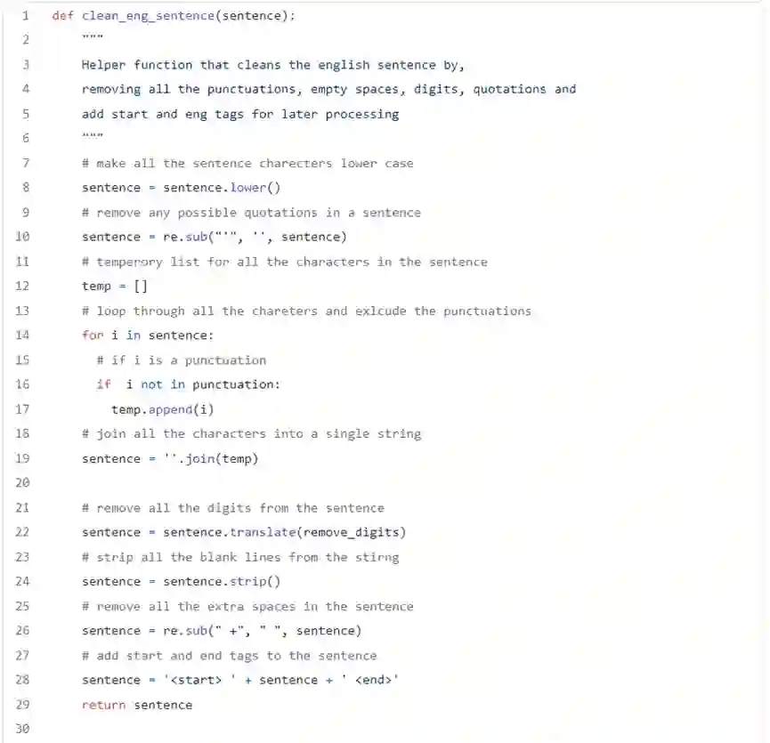3. 接下来,创建一些辅助函数来生成编解码的数据序列,辅助函数为执行特征工程而设。辅助函数删除所有的标点符号、空格和不常见的字符,实现句子清洗,它把每个句子转换成一个向量列表,每个向量表示一个句子中的各单词的索引。
