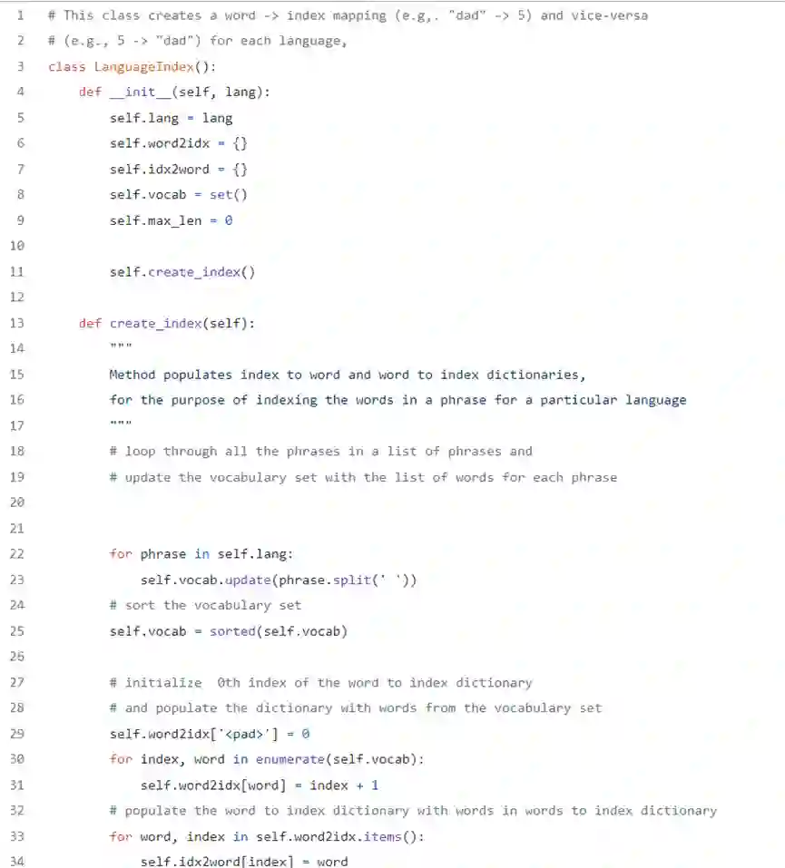 2. 接下来,创建一个执行索引映射的语言索引类(LanguageIndex类)。目的是存储字典中的所有单词,并能够引用它们的索引。这个类还存储了每种语言的最长句的长度。