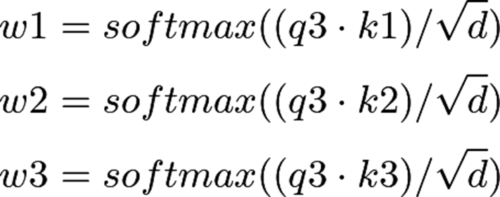 假设有一个有四字单词的句子(s1,s2, s3,s4),要想计算s4的注意力,s4依赖于s3,s3依赖于s2等等。首先,将s3的query向量命名为q3,将s1, s2, s3的key向量命名为k1, k2, k3。为了计算出权值,需要计算query向量q3与所有key向量的点积,将其除以d的平方根。然后,应用softmax函数。结果得出以下三个权重,称之为(w1,w2,w3)。