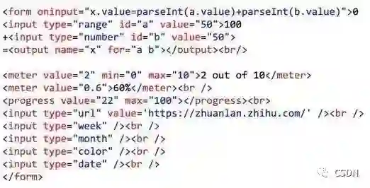早期的表单元素,我们可以从收音机里挖到它们的本源。但经过20年来的发展,网页世界也有自己的创新,各式各样的日历、调试器,于是它们成为浏览器的自带控件了。下面是一些新标签:<meter>、<progress>、<outer>、 <datalist>,此外更多功能是复用到 input 标签,各种类型的日历、月历、年历、时间。