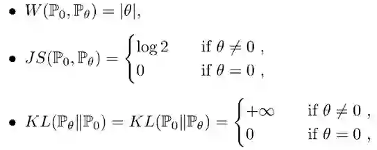 可以看到当 θ 趋近于 0 时,在 Wasserstein 距离衡量下,P1 会趋近于 P0。而其他距离在两个分布不重叠的时候是常量,在两个分布重叠时有一个突变。所以在低维流形上学习概率分布时,可以通过 EM 距离进行梯度下降,而不能通过 JS 距离,因为它作为 loss function 是不连续的。