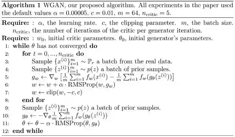 WGAN 的算法如下,与普通 GAN 对比,判别器和生成器的 loss function 都去掉了 log,判别器的最后一层去掉了 sigmoid(因为不用限制 D 的输出是 0~1),以及为判别器网络增加了 clip。
