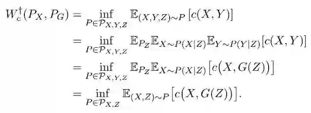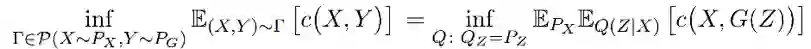 这样就可以将 OT 距离的从找在同一个空间的两个随机变量(分别服从 Px 和 Pg)的某个联合分布转变成了,对 Px 找一个条件分布(也就是 encoder),使边缘概率与先验概率 Pz 相同。