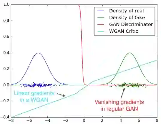 WGAN 的提出是为了克服普通 GAN 出现的梯度消失的问题。Wasserstein 距离与 JS 散度,KL 散度的区别在于,这个距离在两个分布不重叠的时候也是连续的。