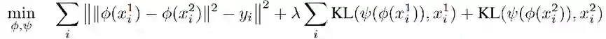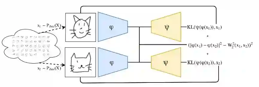 DWE 方法如图所示,从一个数据分布中得到两个采样,分别作为 encoder Φ 的输入,然后通过在 embedding 层使欧氏距离的平方模仿 Wasserstein 距离,用另一个 decoder 网络 Ψ 重构输入的图片,用 KL 散度计算重建误差(选择 KL 散度是因为 x 分布)。训练的目标函数为: