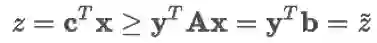将新变量 y 作为未知变量,将最小化问题转变成了最大化问题。经过转化后,z* 的取值就直接取决于 b(包含 Pθ)。可以看到这个是 z 的下限(实际上可以证明
