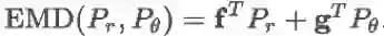 由于存在约束条件,可以得到 f(xi) + g(xj) ≤ Dij。由于当 i = j 时,Dij =0,则 f(xi)≤-g(xj),因为两个分布一直非负,所以要最大化,就要最大化,这个求和式在 f = -g 时取到最大值 0。
