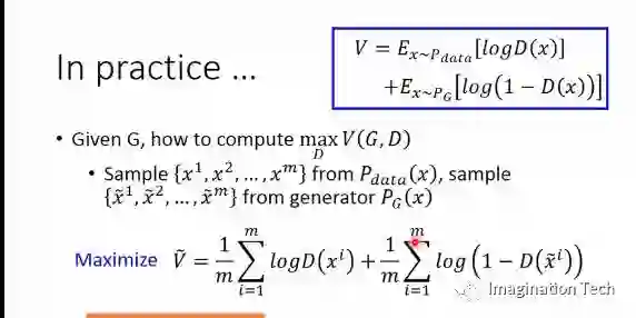首先,既然直接计算期望而不可得,我们只能退而求其次,从Pd中sample 出m个样本,再从Pg中sample出m个样本,最大化D(x)在这2m个样本的V值,如下图所示: