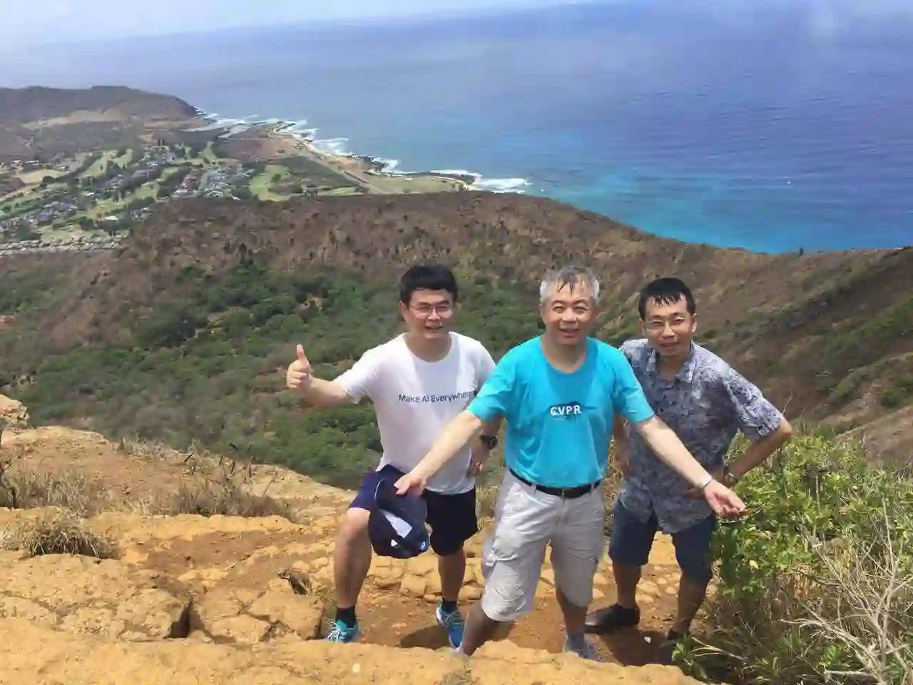 夏威夷是度假胜地,爬Trail是受到大家欢迎的活动之一。爬Trail有点像做研究,只有付出很大的努力,才能抵达高峰,一览众云低,湖光山色尽收眼底。图片来源:(上)张正友(CVPR17 General Co-Chair)、(下)杨林(UFL佛罗里达大学副教授)。