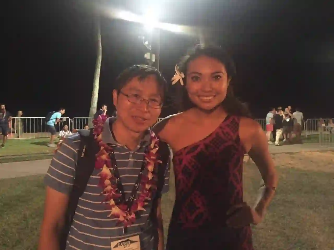 大会晚宴在Wakiki海滩边的公园举行。酒足饭饱之后,大会请来当地的夏威夷风情的歌舞表演团给大家助兴,演员中包括夏威夷小姐。于是,就有了王井东(微软Lead Researcher)与夏威夷小姐的“第一次亲密接触”。