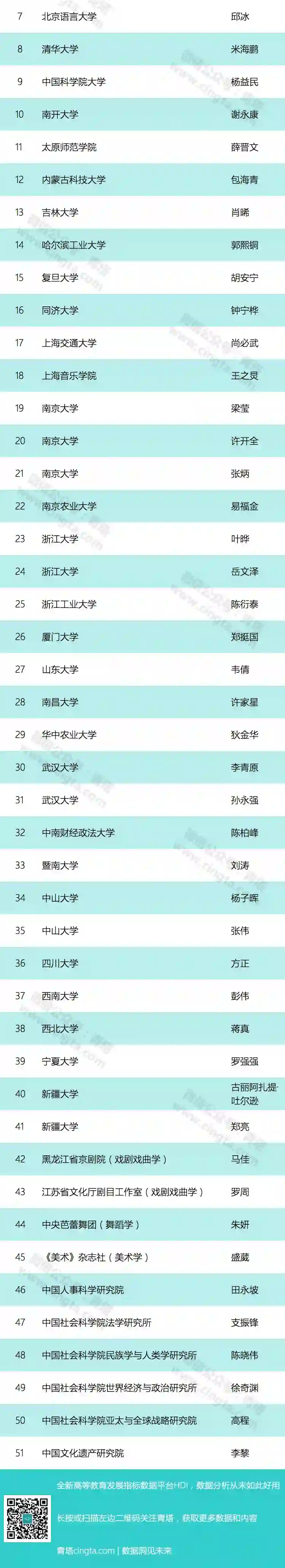 其中清华大学入选25人位居各单位第一,包括13名科技创新领军人才、2名哲学社科领军人才、1名教学名师和9名青年拔尖人才。浙江大学共有23人入选,位居第二。北京大学、哈尔滨工业大学、华中科技大学、复旦大学、上海交通大学、中国科学技术大学、武汉大学等高校入选数也较多。