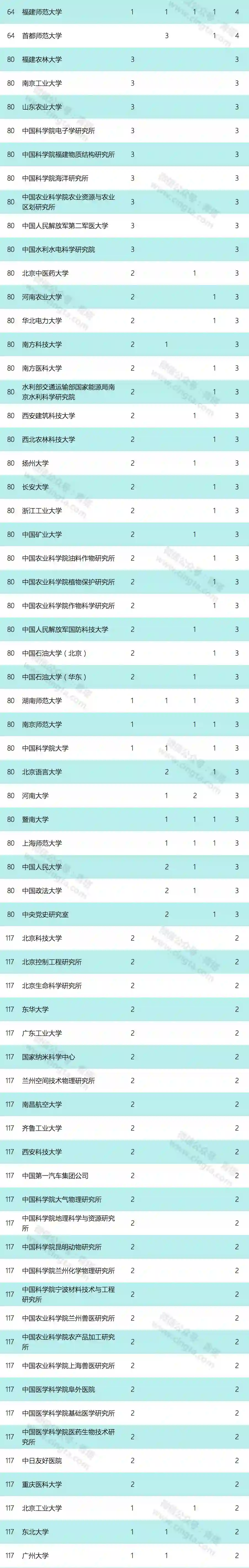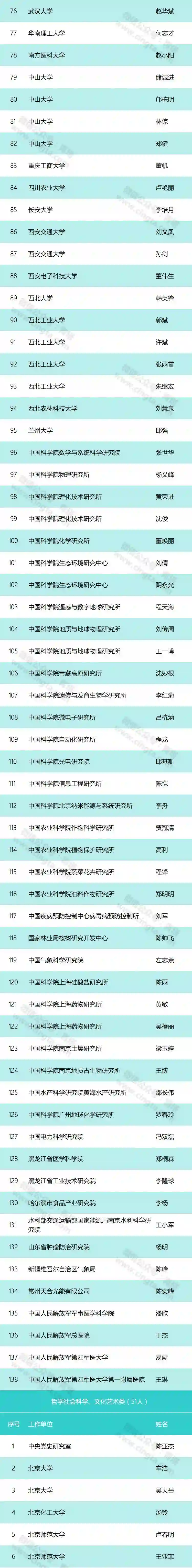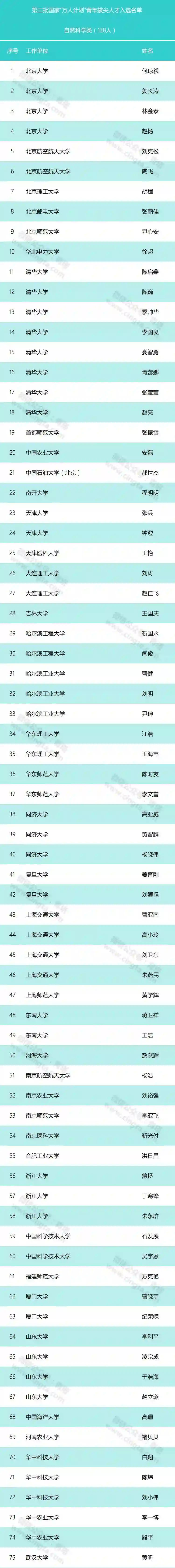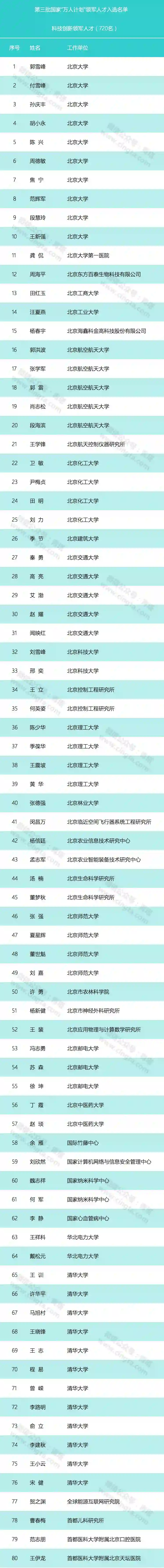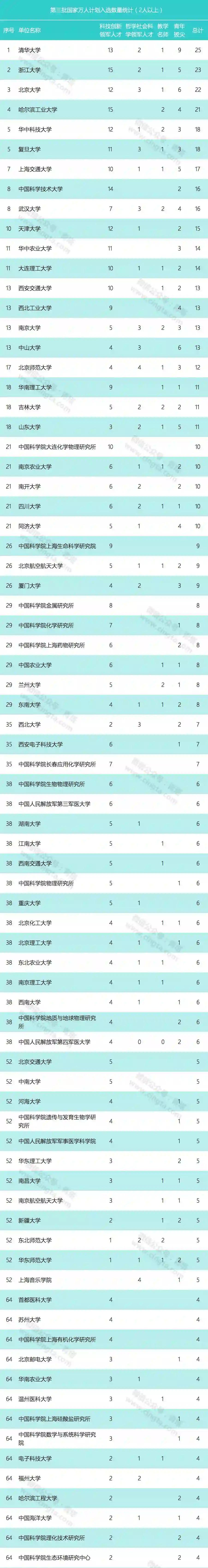 第三批国家万人计划入选者的工作单位统计和具体名单如下(统计结果不含科技创业领军人才;各高校附属医院、研究生院纳入高校进行统计;仅统计入选人数在2人以上的单位):