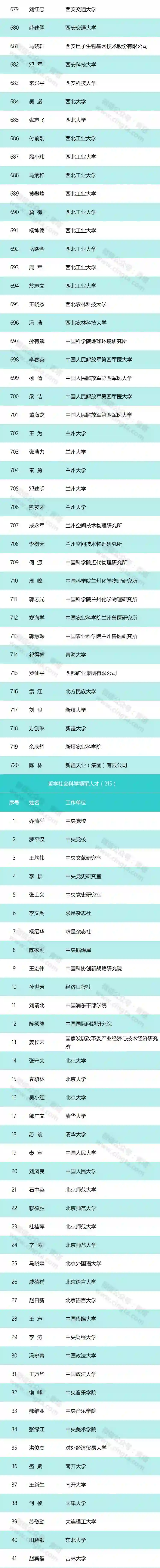 日前,中共中央组织部办公厅下发《关于印发第三批国家“万人计划”入选人员名单的通知》。第三批国家“万人计划”入选人员名单包括两个层次的五类人才,共计1635人,其中科技创新领军人才720人,科技创业领军人才367人,哲学社会科学领军人才215人,教学名师195人;青年拔尖人才138人。