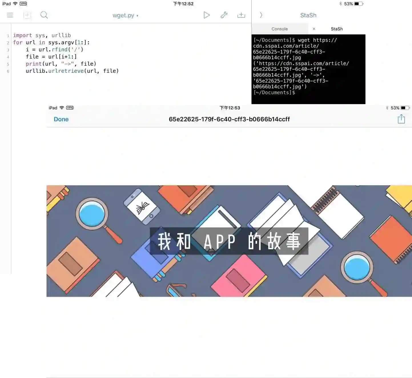 在很多年之前,我刚刚拥有第一代 iPad mini 时候,我就一直对 iPad 上工作方式进行探讨。印象最深刻的是 MacStories 上的一个故事,iPad + Linode, 1 Year Later,讲的是一个程序员放弃了 MacBook,而是买了一台 iPad,租一个 Linode 公司的服务器来继续他日常的工作。正像图中所示那样,根本没有什么 Pro 版本的 iPad,也没有分屏或者文件拖拽,那仅仅是一台,刚刚具备多任务能力的 iPad 2。