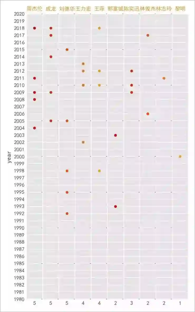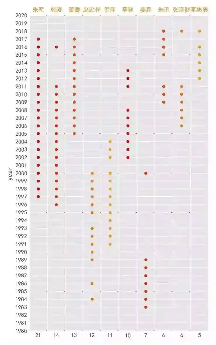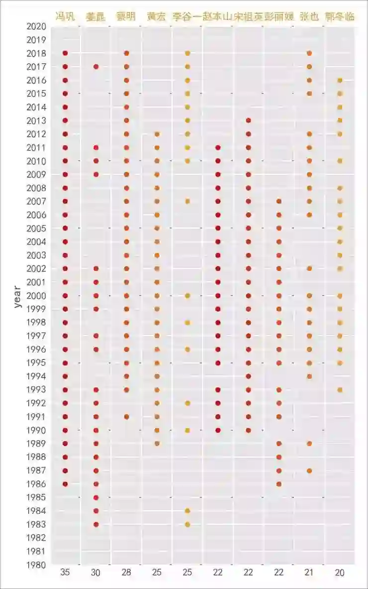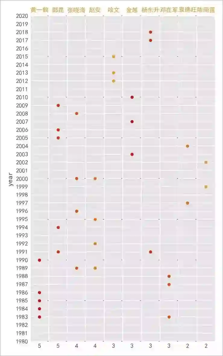 部分演员表演次数和图中点数不一致,是因为某些年 TA 不只表演了一个节目