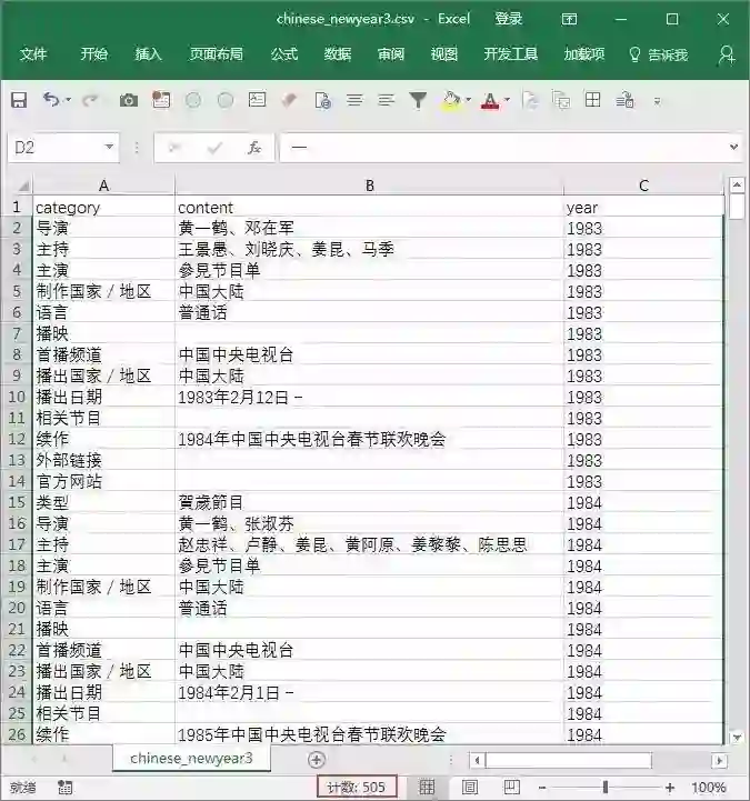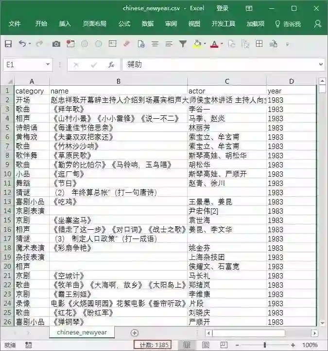 网上搜了挺久都没有找到齐全的春晚节目数据,连春晚官网也没有,结果在维基百科上找到了。