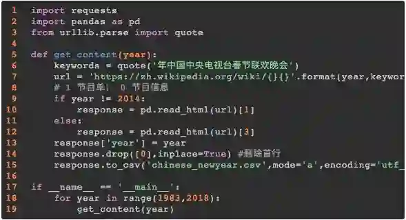 Python 抓取这类表格数据,方法简单,几行代码就能搞定,修改 URL 的 page 参数,可以循环遍历抓取 1983 到 2018 年所有的节目数据。
