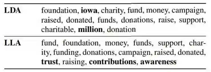 解释性 LLA和LDA都能对全局主题做出揭示,LLA 总结出的要更加明确。如下表,LDA 会总结出“Iowa”,仅仅因为它在不同的文档中都出现了;而 LLA 追踪短期动态的特性可以让它在句子的不同位置正确切换主题。