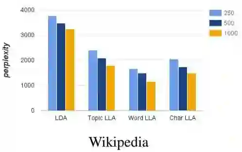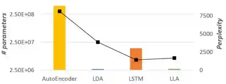 LLA 继承了 LDA 模型的稀疏性和可解释性,同时还具有 LSTM 的准确率。作者们在文中提供了多个 LLA 的变种,在保持解释性的前提下尝试在模型大小和准确率之间找到平衡。如图1所示,在基于Wikipedia数据集对语言建模的任务中,LLA 取得了接近 LSTM 的准确率,同时从模型大小的角度还保持了与 LDA 相同的稀疏性。作者们提供了一个高效的推理算法用于LLA的参数推理,并在多个数据集中展示了它的功效和解释性。