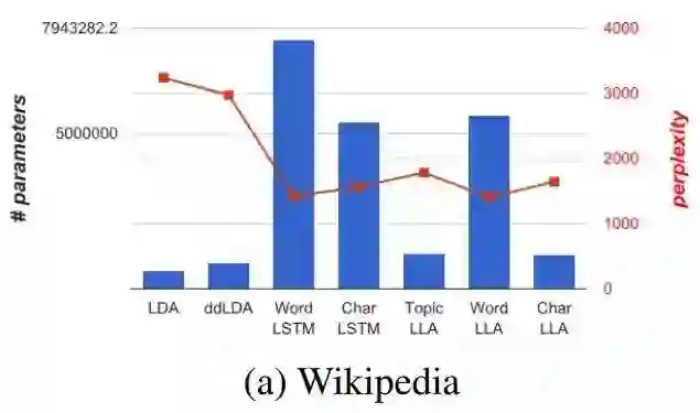 柱状图是参数数量,折线是复杂度。根据图中示意,在基于 Wikipedia 数据集的语言建模任务中,LLA 比 LDA 的复杂度更低,参数数量也比 LSTM 大大减少。