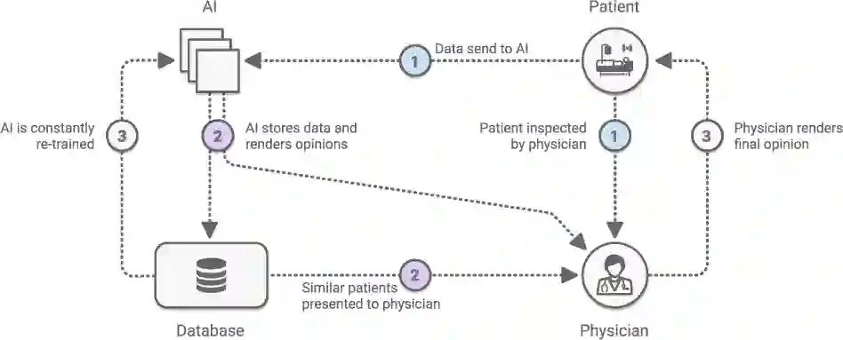 这些技术很大程度上依赖于监督学习,它利用包含数据点(如图像)和数据标签(如对象类)的数据集。考虑到医学数据的稀疏性和访问困难,迁移学习——算法首先在一个大型且不相关的语料库(如ImageNet4)上进行训练,然后在感兴趣的数据集(如医学)上进行微调——对进展至关重要。为了减少与收集和标记数据有关的费用,正在开发生成合成数据的技术,例如数据增加和生成式对抗网络。研究人员甚至表明,众包图像注释可以产生有效的医学算法。最近,自监督学习——从数据点中提取隐式标签并用于训练算法(例如,预测由分割图像生成的瓦片的空间排列)——已经将该领域推向了完全的无监督学习,这种学习不需要标签。将这些技术应用于医学将减少开发和应用的障碍。