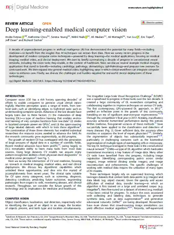 最新的一期Nature子刊《npj Digital Medicine》来Salesforce、Google、斯坦福的Jeff Dean人撰写关于深度学习在医疗视觉的应用,值得关注!