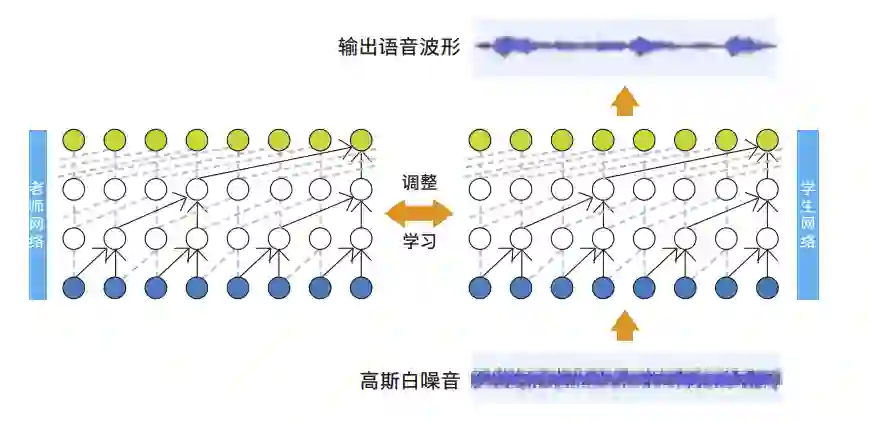定制化 pWaveNet 声码器解决方案,在 WaveNet 模型的基础上引入“概率密度蒸馏”技术,利用一个已经训练好的 WaveNet 模型来指导实施生产的网络进行预测,这样不仅可以摆脱依赖于先前已生成点作为输入条件的顺序生成模式,还能够一次性生成整个序列上的输出采样点,大幅减少语音合成时间。