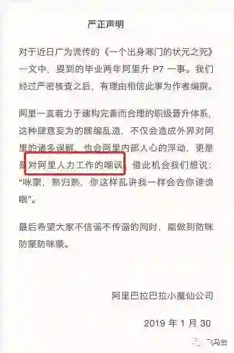 阿里今天早上发了严正声明,表示“阿里一直着力于构建完善而合理的职级晋升体系,这种肆意妄为的瞎编乱造,不仅会造成外界对阿里的诸多误解,也会(造成)阿里内部人心的浮动,更是对阿里人力工作的嘲讽。”