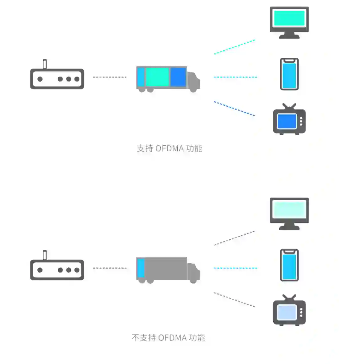 OFDMA 功能也可以打个形象的比方:物流中心给某个客户发货的时候,发现卡车没填满,老的调度系统(Wi-Fi 5)会选择直接发货,然后再给下一个客户发货,下一个客户同样没填满卡车,依次往复;而新的调度系统(Wi-Fi 6)会尝试填满整个卡车,这个卡车会一次性把所有的货物发给每个不同的客户。OFDMA 技术可以帮助设备访问互联网时大幅度减少延迟,提高传输效率。