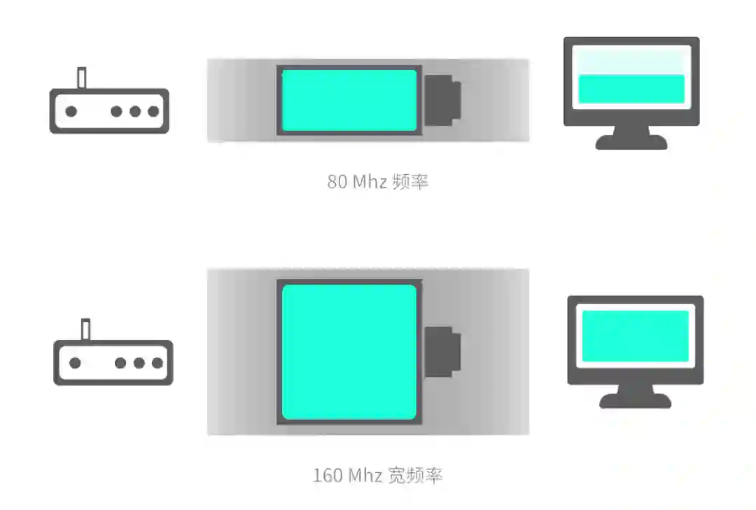 160MHz 宽频段技术同样来自 Wi-Fi 5。经过 Wi-Fi 6 无线认证的无线路由器/接入点会完整支持 160MHz 宽频段。频段宽度就和道路宽度一样,更宽的频段能一次运输更多的数据,也就是更宽的道路可以开更大的卡车一次去运输更多的货物。过去既定的「道路宽度」是 80MHz。所以 160MHz 宽频段可以使用连续的 80MHz 频段,也可以使用非连续的 80MHz 频段组成,非常自由。
