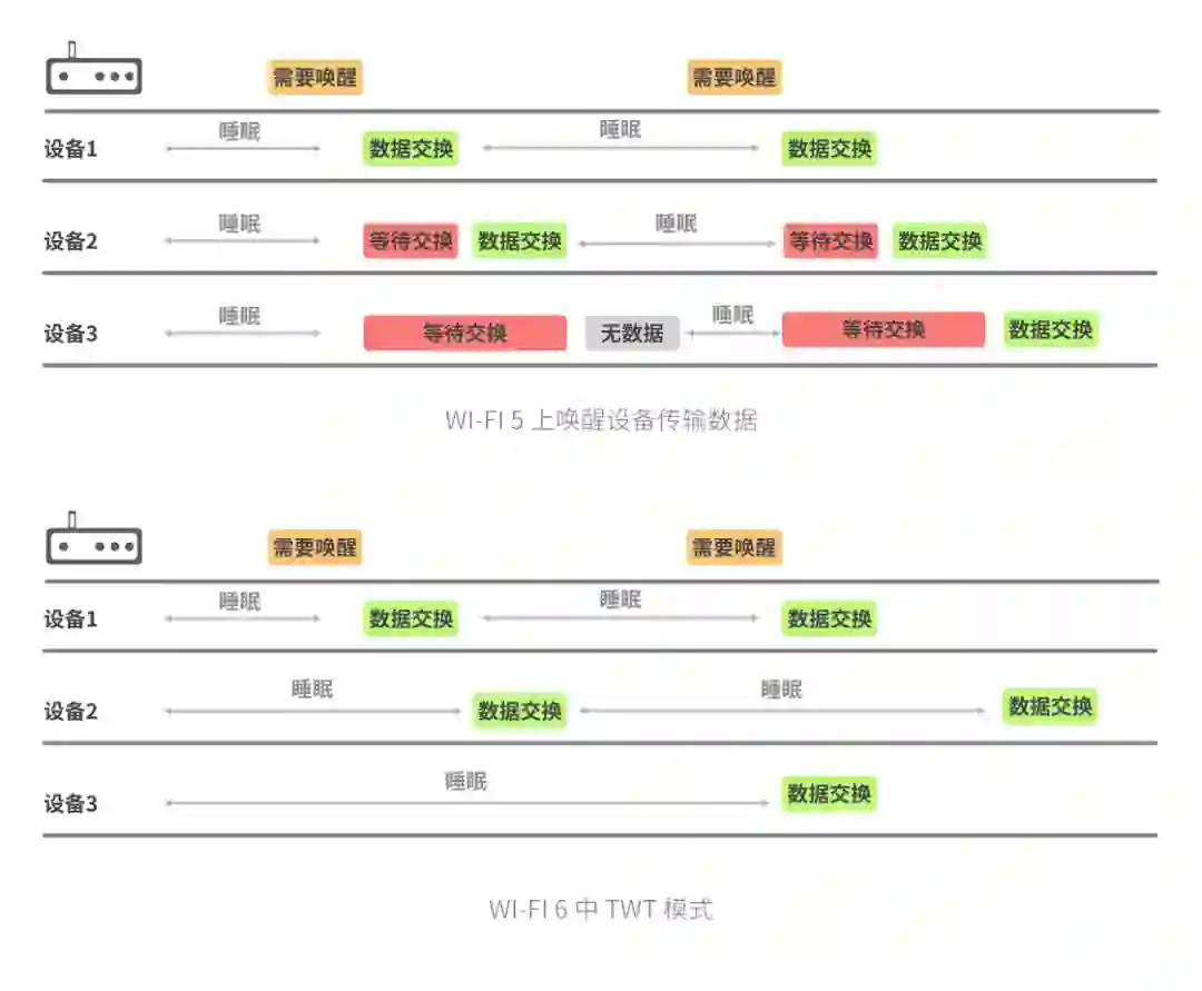 过去 Wi-Fi 协议使用的节能模式会周期性地主动唤醒设备,让设备接收存放在无线路由器/接入点缓冲区中的数据。而有些设备(比方说部分 IoT 传感器)可能不需要那么频繁的唤醒,过于频繁的唤醒反而会让它们的电池寿命缩短很多。