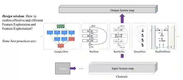 考虑一个building block,其目标是如何对输入特征图进行可学习的变换,从而使得输出特征图能更好的完成当前的任务。设计方面,关键之一是如何实现高效且均衡的特征探索(Feature exploration)和特征利用(Feature exploitation/reuse)。应用方面,我们针对不同硬件平台(比如,云计算、移动计算和嵌入式等),通常面临在相互冲突的模型复杂度和运算有效性两个方面的折中选择;模型复杂度,通常包括比如,多少个building blocks以及每个block的特征维度,即深度和宽度等;模型运算有效性,通常使用客观上浮点计算量的大小或直接使用实际硬件平台的运算时间等。图3列出一些目前最流行的building blocks,包括大名鼎鼎的ResNet[9] 和DenseNet [10]。