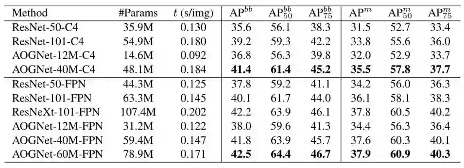 MS-COCO物体检测和实例分割数据集。MS-COCO是目前最通用的物体检测和分割的数据集。我们在最新的maskrcnn-benckmark的代码框架[24,25]下测试了AOGNets,如表2所示,AOGNets取得了比ResNets和ResNeXts都好的性能。
