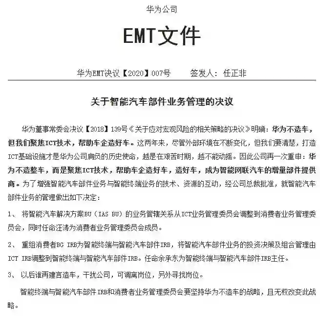 昨日,华为内部网站心声社区刊出华为经营管理团队(EMT)文件(华为EMT决议【2020】007号),正式将华为智能汽车解决方案BU(IAS BU)的业务管辖关系从ICT业务管理委员会调整到消费者业务管理委员会。同时任命汪涛为消费者业务管理委员会成员。华为再次重申,华为不造整车,而是聚焦ICT技术,帮助车企造好车,造好车,成为智能网联汽车的增量部件提供商。“以后谁再建言造车,干扰公司,可调离岗位,另外寻找岗位。”(澎湃)