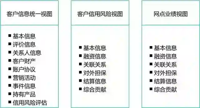 数据资产视图。在建立了数据仓库之后,需要建立统一的分析和可视化平台,解决数据在哪里,数据怎么用的问题。一个典型的应用是建立全行统一客户视图,包含客户信息统一视图、客户信息风险视图和网点业绩视图。