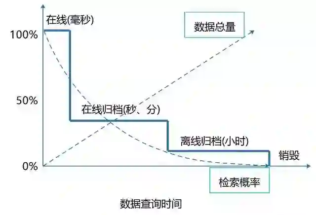 从上图数据生命周期中各参数间的关系中我们可以了解到,数据生命周期管理可以使得高价值数据的查询效率大幅提升,而且高价格的存储介质的采购量也可以减少很多;但是随着数据的使用程度的下降,数据被逐渐归档,查询时间也慢慢的变长;最后随着数据的使用频率和价值基本没有了之后,就可以逐渐销毁了。