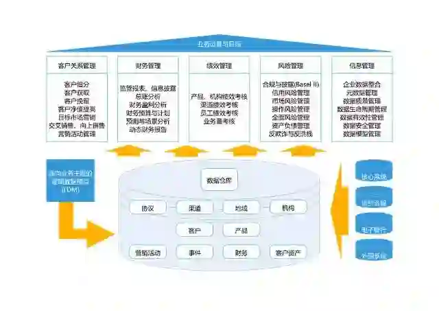 建立结构化数据处理分析平台。数据仓库建设能够实现企业异构数据的集成,企业按照分析主题重组数据,建立面向全行的一致的信息视图。下图是一个典型的银行数据仓库服务体系: