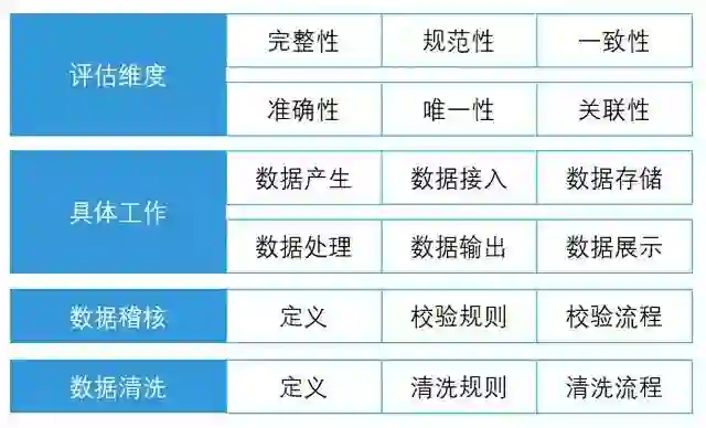 制度和规范。从技术层面上,应该完整全面的定义数据质量的评估维度,包括完整性、时效性等,按照已定义的维度,在系统建设的各个阶段都应该根据标准进行数据质量检测和规范,及时进行治理,避免事后的清洗工作。