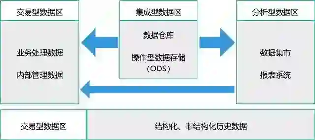 2)集成型数据区。集成型数据区包括操作型数据(OLTP)和数据仓库型数据(OLAP)。
