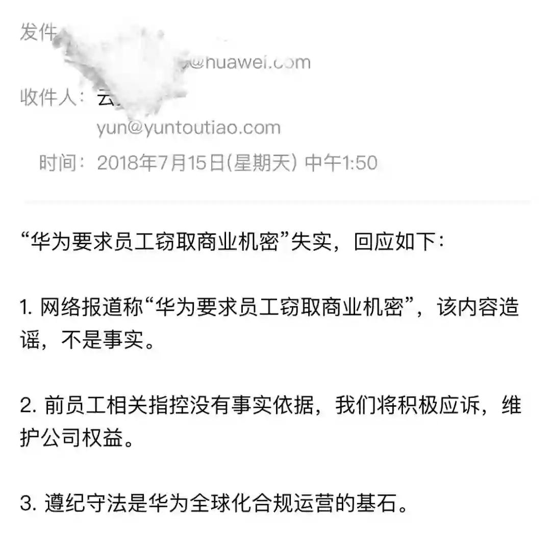1. 网络报道称“华为要求员工窃取商业机密”,该内容造谣,不是事实。