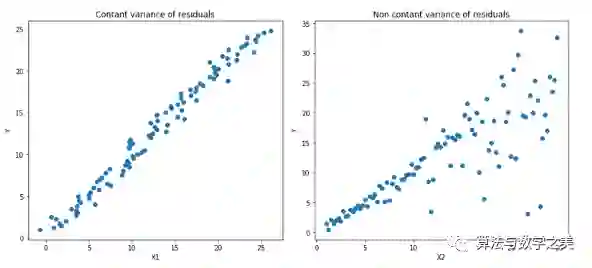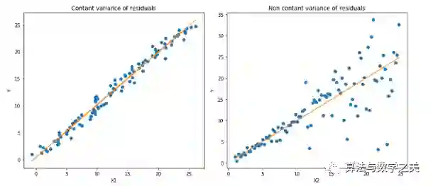 左:线性关系b/w X1和Y,残差的方差恒定。右:线性关系b/w X2和Y,但Y的方差随着X2增加而变大(异方差)。