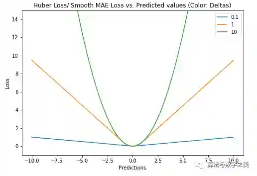 在这种情况下,Huber Loss可能会非常有用,因为它会使最小值附近弯曲,从而降低梯度。另外它比MSE对异常值更鲁棒。因此,它结合了MSE和MAE的优良特性。但是,Huber Loss的问题是我们可能需要迭代地训练超参数delta。