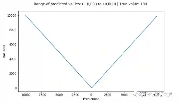 下面是一个MSE函数的图,其中真实目标值为100,预测值在-10,000至10,000之间。预测值(X轴)= 100时,MSE损失(Y轴)达到其最小值。损失范围为0至∞。