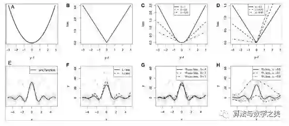 连续损失函数:(A)MSE损失函数; (B)MAE损失函数; (C)Huber损失函数; (D)Quantile损失函数。用有噪声的sinc(x)数据来拟合平滑GBM的示例:(E)原始sinc(x)函数; (F)以MSE和MAE为损失拟合的平滑GBM; (G)以Huber Loss拟合的平滑GBM, = {4,2,1}; (H)以Quantile Loss拟合的平滑GBM。
