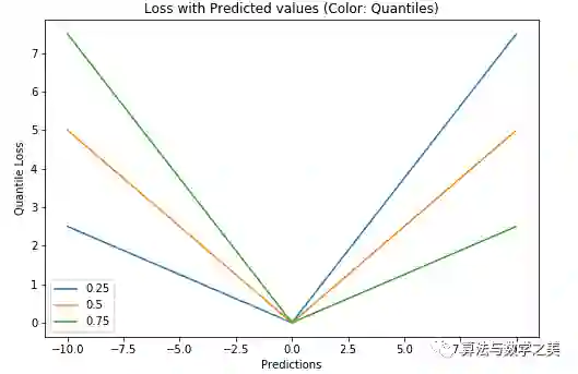Quantile Loss的思想是根据我们是打算给正误差还是负误差更多的值来选择分位数数值。损失函数根据所选quantile (γ)的值对高估和低估的预测值给予不同的惩罚值。举个例子,γ= 0.25的Quantile Loss函数给高估的预测值更多的惩罚,并试图使预测值略低于中位数。