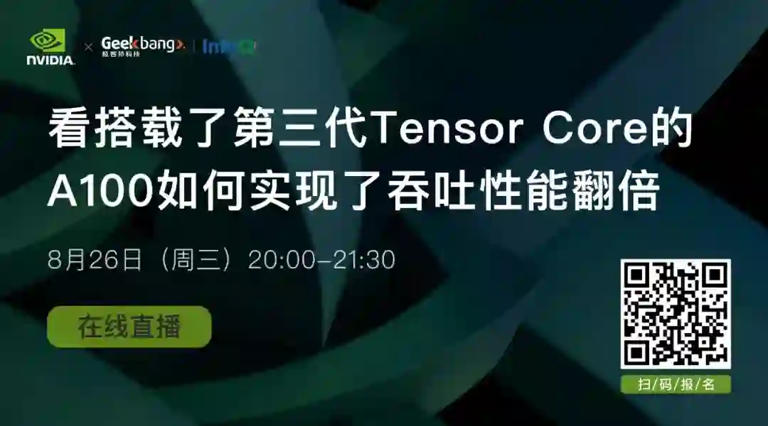 8 月 26 日 20:00-21:30,英伟达 GPU 计算专家为你讲解:相较于 V100, A100 上搭载的第三代 Tensor Core 增加了对 DL 和 HPC 数据类型的全面支持,提高了各精度的运算吞吐能力,同时新增稀疏运算特性,看搭载了第三代 Tensor Core 的 A100 如何实现了吞吐性能翻倍!点击阅读原文或扫描下方二维码报名直播!