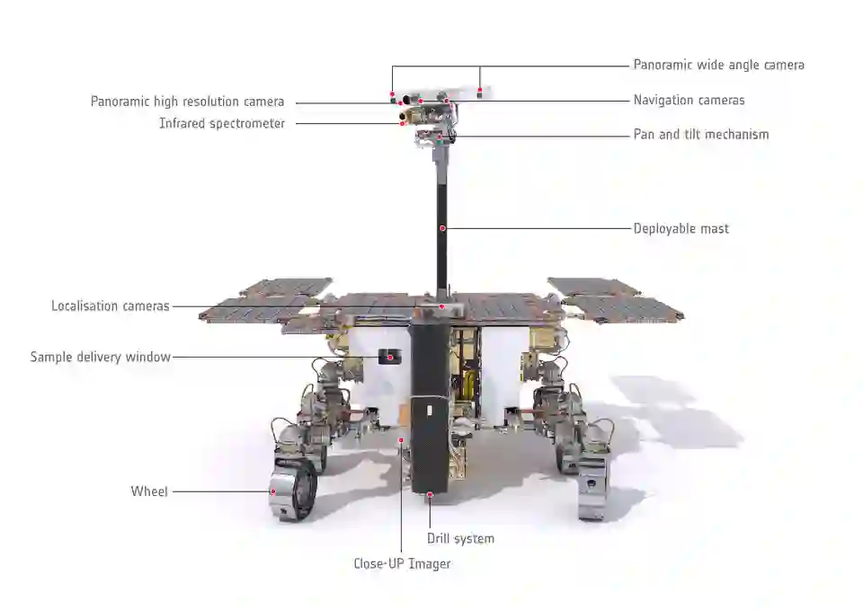 罗莎琳·富兰克林火星车可以通过钻头和实验室搜寻火星上过去生命的证据。它将是第一个在地表下2米深处钻探的探测车,也是第一个使用包括轮式行走在内的新型驱动技术来克服障碍的探测车。
