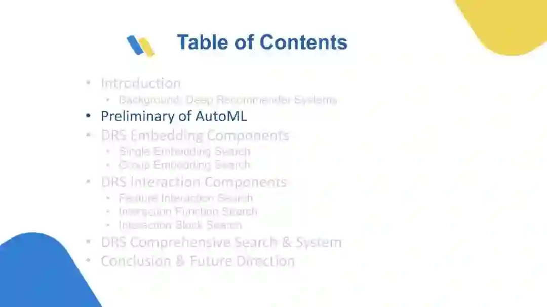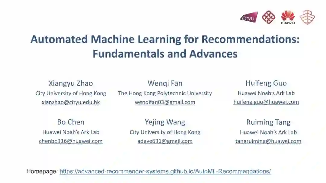 在本教程中,我们将全面介绍高级自动机器学习(AutoML)技术在深度推荐系统中解决上述问题的最新进展。希望相关领域的学术研究者和行业从业者能够对空间有深刻的理解和准确的洞察,激发更多的想法和讨论,并在推荐中推动技术的发展