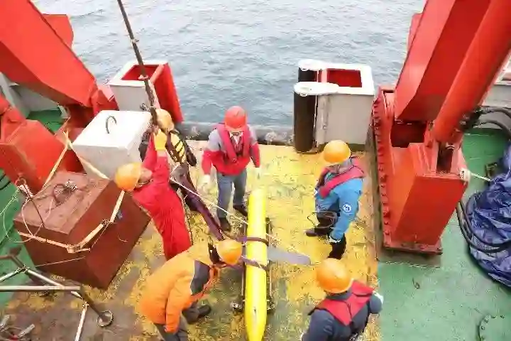 北京时间28日5时23分,考察队队员们将“海翼”号水下滑翔机缓缓送入海中。在成功入海后,“海翼”号开始对所在海域执行剖面观测。