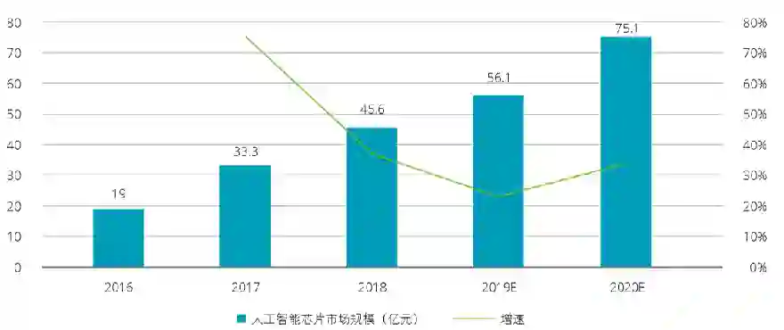 中国人工智能芯片市场规模与增速预测(2016-2020)